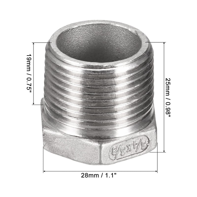 - Male Thread Size: 3/4" PT(26mm); Female Thread Size: 3/8" PT(14.8mm); Male Thread Length: 19mm / 0.75 Inch; Female Thread Length: 10mm / 0.39 Inch; Overall Size: 26x28mm / 1.02x1.1 Inch (L*Hex.W); Max Pressure: 16 MPA