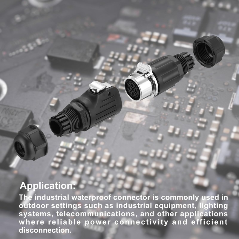 Fast Lock Connect: The industrial connector adopts a quick-lock design, which is very easy to connect and simplifies the assembly process for users.Application: The industrial waterproof connector is commonly used in outdoor settings such as industrial equipment, lighting systems, telecommunications, and other applications where reliable power connectivity and efficient disconnection.
