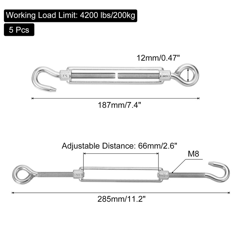 In the package of 5pcs x M8 Hook and Eye Turnbuckles. These are in Min Extended Length: 187mm / 7.4inch, Max Length: 285mm / 11.2inch, Eye Hole Diameter: 12mm/ 0.47 inch, Adjustable Distance: 66mm / 2.6 inch, Working Load Limit: 4200 lbs/200kg