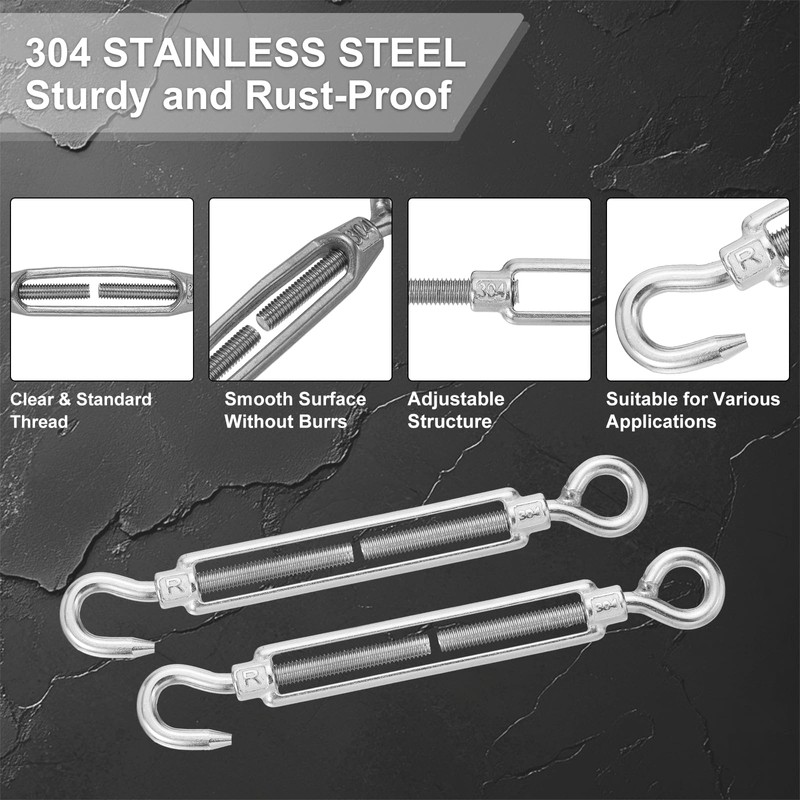 - 304 stainless steel hook and eye turnbuckles are commonly used in rigging, marine, construction, and industrial settings to provide tension and adjust the length of wire rope, cable, and tie-downs in a variety of applications.