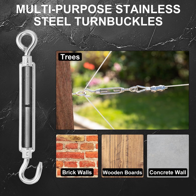 These 304 stainless steel hook and eye turnbuckles are commonly used in rigging, marine, construction, and industrial settings to provide tension and adjust the length of wire rope, cable, and tie-downs in a variety of applications.