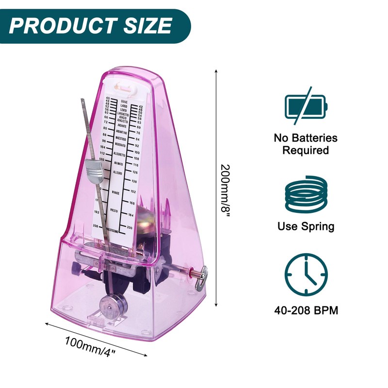 - Mechanical metronome size: 200mm x 100mm/8inch x 4inch(HxW),Beat Range: 40-208 beat per minute,Color:Transparent Pink,In the package of:1x piano metronome