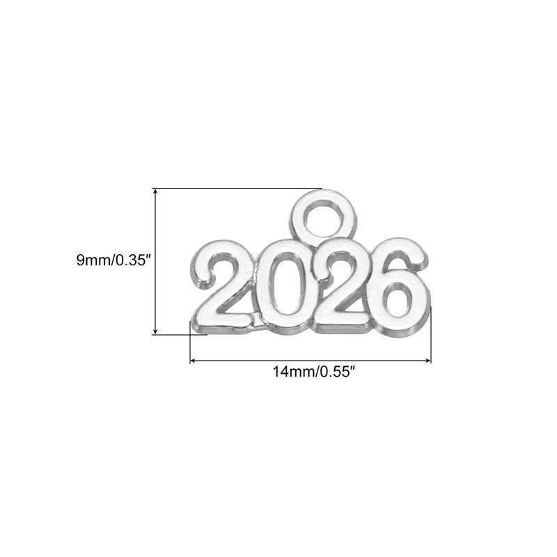 - These Metal Year Number Charm, is in size of: Length: 14mm(0.55 inch); Width: 9mm(0.35 inch); Material: Alloy; Color: Silver; In the package of: 50pcs x Year 2026 Charm;