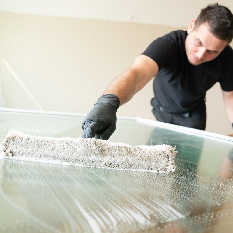 It is made of soft microfiber. The head removes the shower water with ease and no noise. Make your shower glass washing quick and smooth.