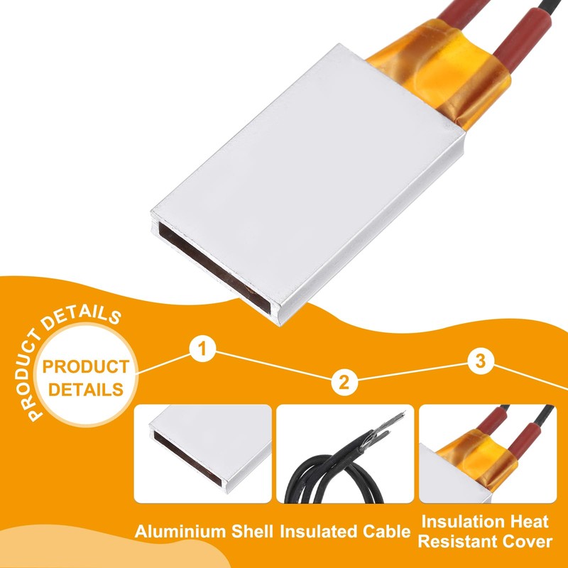 - PTC Heating Plate, is in size of: 35mm x 21mm x 5mm / 1.38-inch x 0.83-inch x 0.2-inch (L x W x H); 150mm / 5.91 inch wire length; Shell Material: Aluminium; Heating Medium: PTC Ceramic; Rated Power: 2W-50W; Rated Voltage: 24V; Rated Temperature: 70C