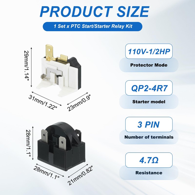 • PTC Compressor Start Relay and Overload Protectors Kit. 4.7 Ohm 3 Pin resistance refrigerator compressor starter relay. QP2-4R7 model refrigerator PTC starter relays. 110V-1/2HP-Side Terminal refrigerators overload protectors. You will get 1pcs PTC refrigerator coolers compressor starter relay and 1pcs refrigerator compressor overload protectors.