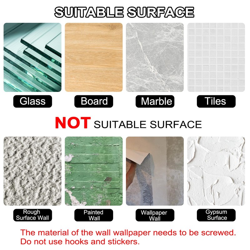 2. The wallpaper material needs to be fixed with screws, please do not use hooks and stickers