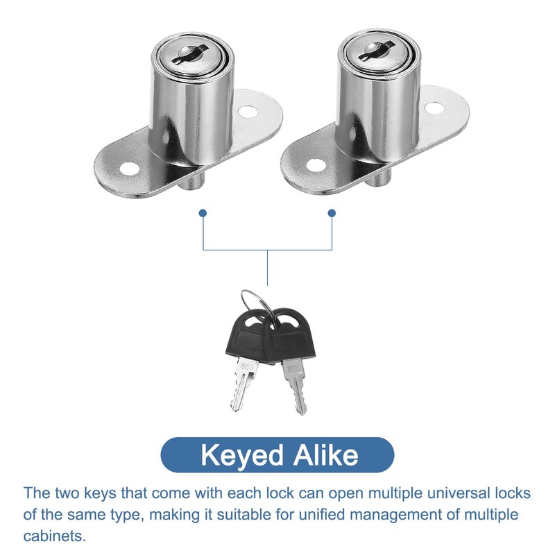 The Push Plunger Lock Keys We Provide: Cylinder Diameter: 19 mm/3/4 Inch; Cylinder Length: 22 mm/7/8 Inch; Length of the Lock: 50 mm/1.97 Inch; Length of Plunger Pin: 22 mm/7/8; Length of the Screws: 15 mm/0.59 Inch; Color: Silver; Material: Zinc Alloy; 4 Pcs x Lock + 8 Pcs x Screws