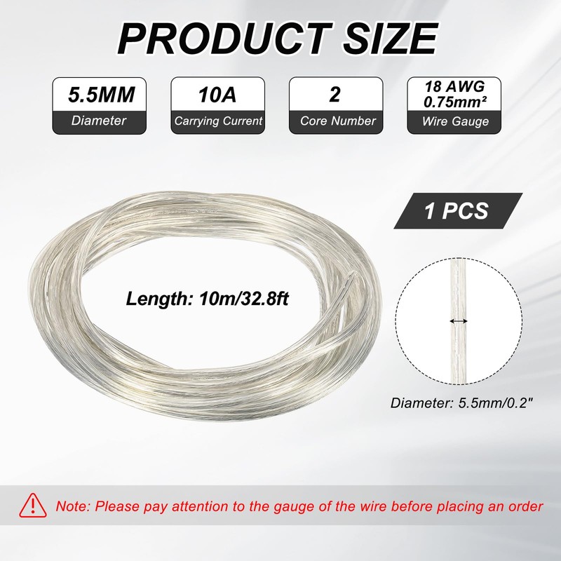 Material: PVC, Copper Wire;Diameter: 5.5mm;Carrying current:10A,Color: Clear;Core Number: 2; Wire Gauge: 18AWG/0.75mm²; Length: 10m/32.8ft; Package Content: 1x Twisted Cloth Covered Wire