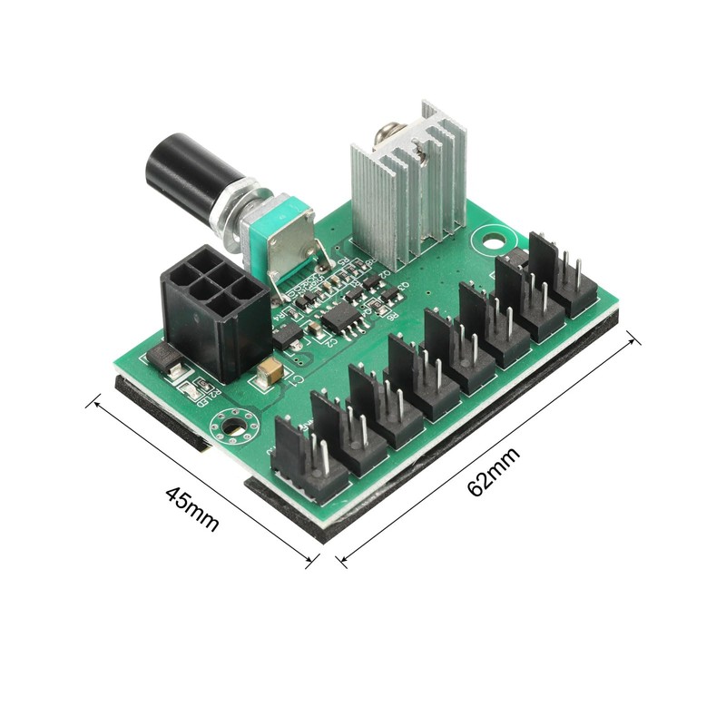 A PWM driver module with a 2-pin, 3-pin, and 4-pin cooling fan hub, along with a 6-pin port 8-way splitter fan adapter, is a device that allows you to control and connect multiple fans to your system.