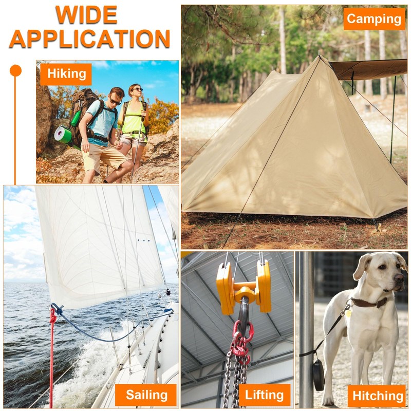 Quick connectors can be attached to chain connectors, backpacks, porch swings, handbags, swings, pet chains, pet, shade sails, fence gate fitness equipment, or chandeliers to play a hanging and fixing role, they can also be used for outdoor activities such as camping, fishing, hiking, travel, etc.