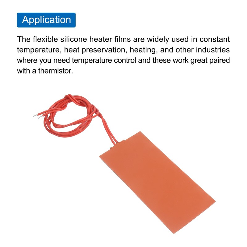 - Package Content: 1pcs x Silicone Heating Pad; Lead Wire Length: 500mm/20 inch; Heating Film Size(LxW): 100mmx50mm/3.94x1.97 inch; Rated Voltage: 12V; Rated Power: 15W; Thickness: 1.5mm; Rated Temperature: 200°C/392 ℉; Material: Silicone