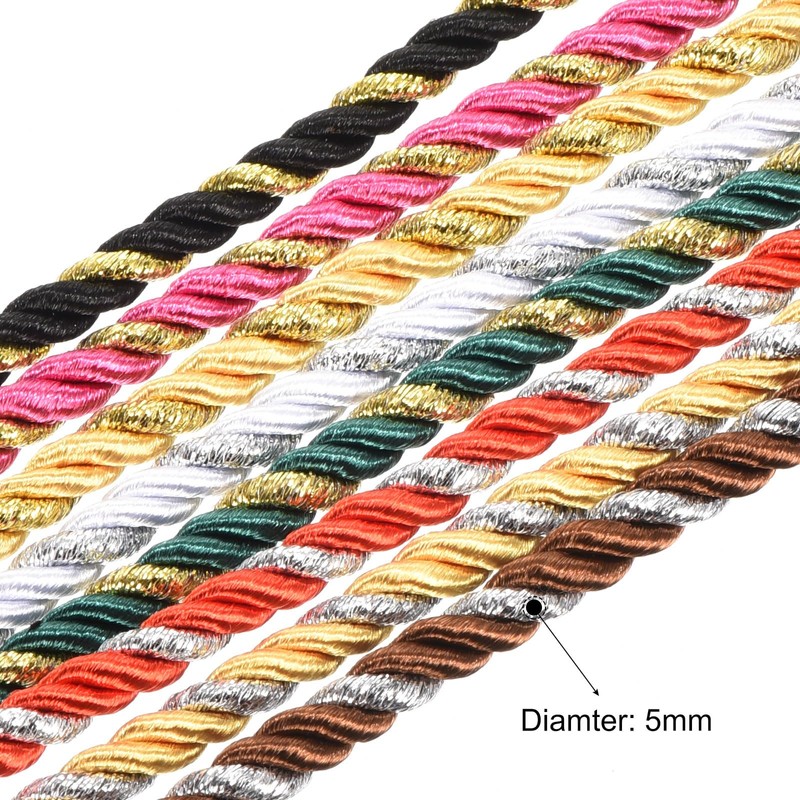 - 1/5 Inch × 5 Yard (5mm × 5m) twisted cord trim. Twisted Cord is used in DIY crafts. In jewelry making, twine thread cord is used to make pendants, bracelets, and earrings. In home decoration, twisted cord is used to make handmade cards, photo frame decorations, gift bag making, curtain decoration, etc. Twisted Cord also plays an important role in clothing and bag decoration. Braided twisted rope can be used to decorate graduation honor hats, skirts, cuffs, necklaces, handbags, backpacks, etc.