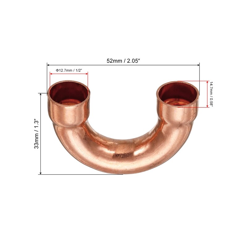 Package Content: 5pcs x Copper Pipe Fitting; Inner Diameter: 12.7mm / 0.5 inch(1/2"); Outer Diameter(Approx): 14.7mm / 0.58 inch; Overall Size: 52x33mm / 2.05x1.3 inch(W*L)