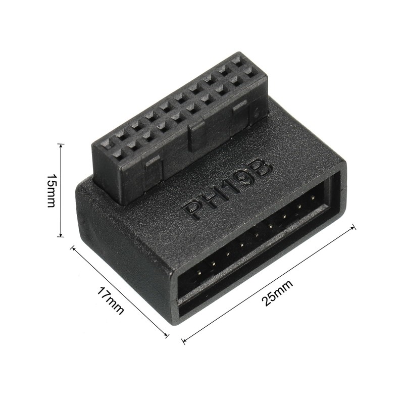 • Main Color: Black; Total Size: 27mm x 17mm x 15mm/ 1.06" x 0.67" x 0.59" (LxWxH); In the package of: 2 x USB 3.0 19Pin 90 Degree Adapter
