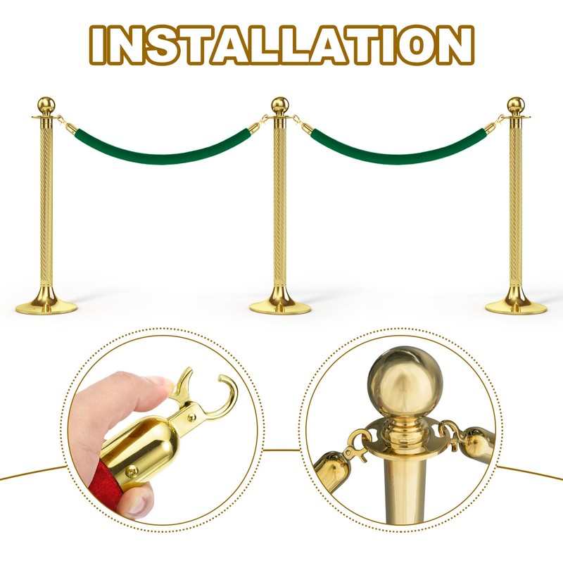 Steps of installation: Simply attach the snap hooks to your stanchion posts or stands and create a secure barrier or queue divider in seconds. The snap hooks on both ends of the VIP rope make it easy to attach to stanchion posts, stands, or any other compatible fixtures.