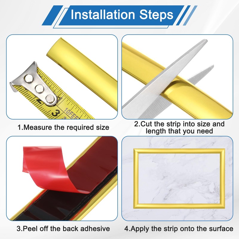 - Self-Adhesive Molding Trim: Size: 10mm x 16 meter / 0.39 Inch x 52 ft (W x L); Material: PVC; Color: Gold;