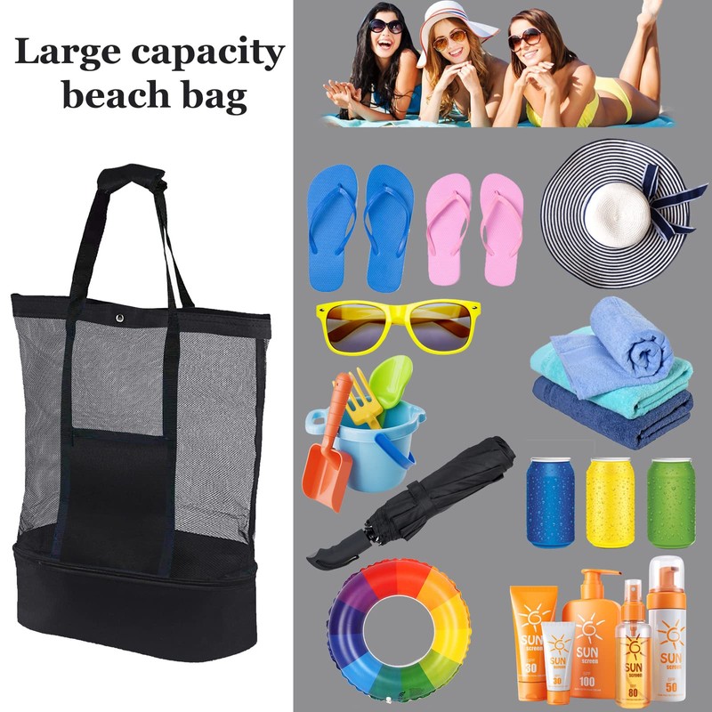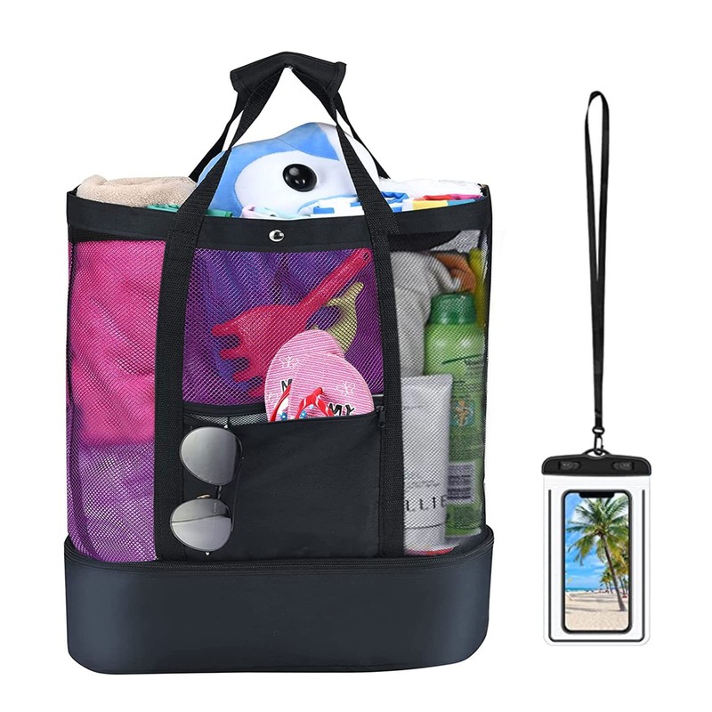 Mecctuck Beach Bag, Mesh Beach Bag, Sand Toy Mesh Bag, Reusable Foldable Extra Large Foldable Family Mesh Beach Bag, Mesh Swimming Bag with Waterproof Bag (Black)
