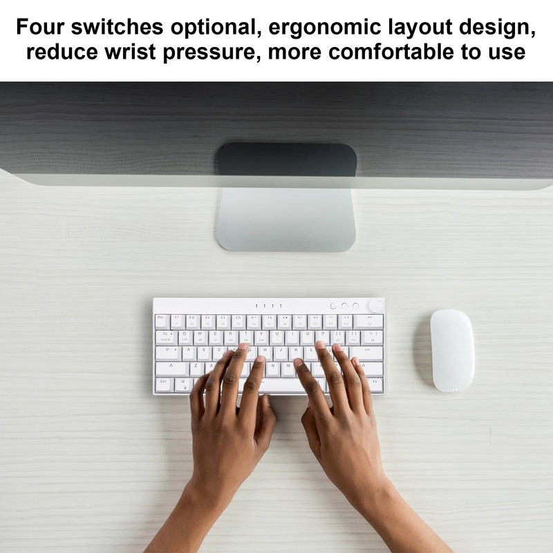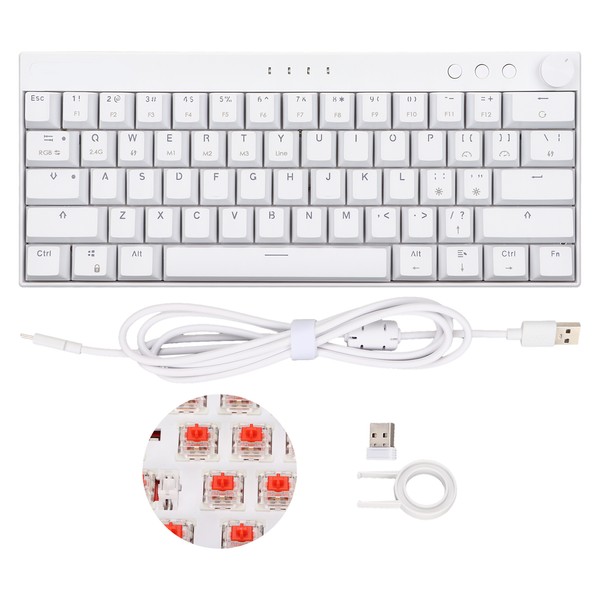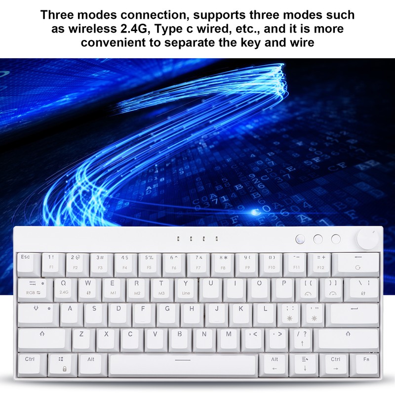 1、Three Modes Keyboard: Mechanical keyboard adopts three modes connection, supports wireless 2.4G, BT 3.0,BT 5.0, Type c wired three modes, and the separation of key lines is more convenient. 2、61 Keys: The optimized 61 keys layout still retains the functions of a complete keyboard, streamlines the size, does not reduce the functions, and makes it easy to carry. 3、RGB Dynamic Backlight: 61 keys mechanical keyboard cool and colorful lights can be switched at will, the light speed and brightness can be adjusted as you like, the keycaps are transparent and very cool. 4、Four Switches: RGB keyboard has black switch, blue switch, red switch, Alternate Action optional, and adopts ergonomic layout design to reduce wrist pressure and make it more comfortable to use. 5、N Key Rollover: Built in 1800mAh battery, long lasting battery life, can be charged when wired; pressing all keys at the same time does not conflict with each other, quick response, quicker operation.