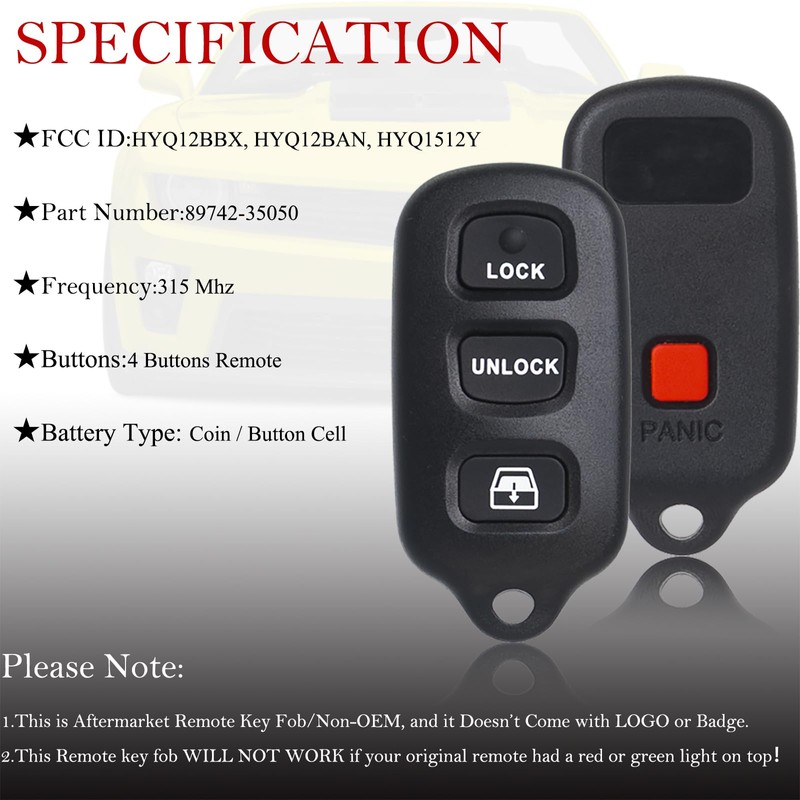 - COMPATIBILITY: Compatible with FCC ID HYQ12BBX, HYQ12BAN, HYQ1512Y. This Remote Key Fob Replacement Is Compatible with 1999-2009 Toyota 4Runner & 2001-2007 Toyota Sequoia.It Will Not Work If Your Original Remote Has a Red or Green Light on The Top.