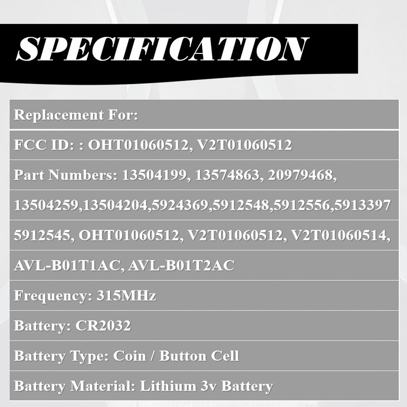 - REPLACEMENT: This Keyless Entry Remote Start Control Car Key Fob Replacement Is Compatible with Part Numbers: 13504199, 13574863, 20979468, 13504259, 13504204 5924369, 5912548, 5912556, 5913397, 5912545 OHT01060512, V2T01060512, V2T01060514, AVL-B01T1AC, AVL-B01T2AC Note: It only Supports Regular Key Vehicles, It Doesn’t Supports Push Start Button Vehicles.