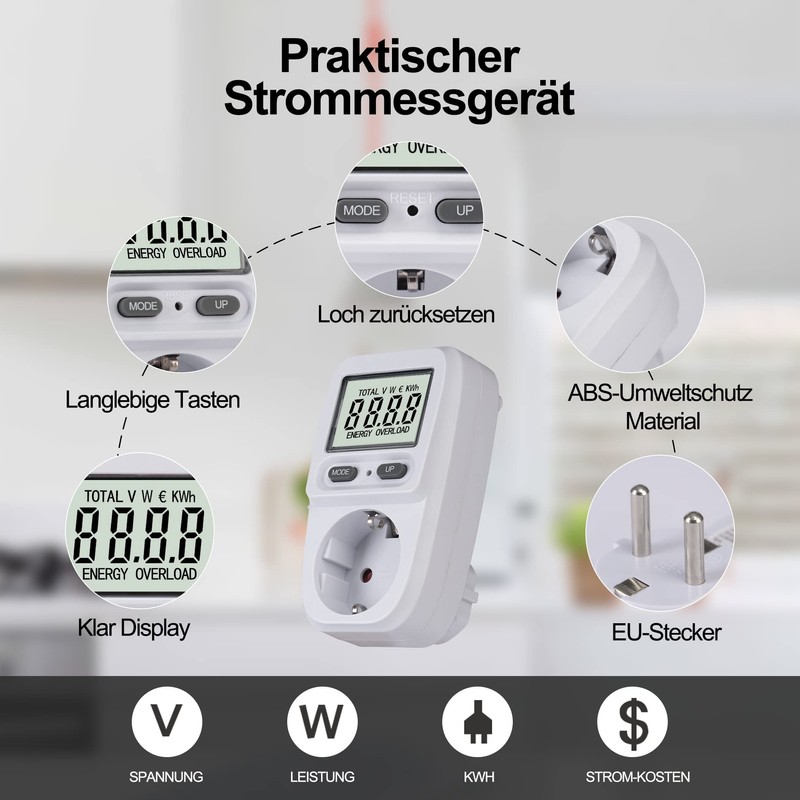 - Easy to use electricity meter socket: 2 simple buttons. Don't worry about complicated instructions and operating steps, our power meter with 2 simple buttons has an easy to read German user manual.