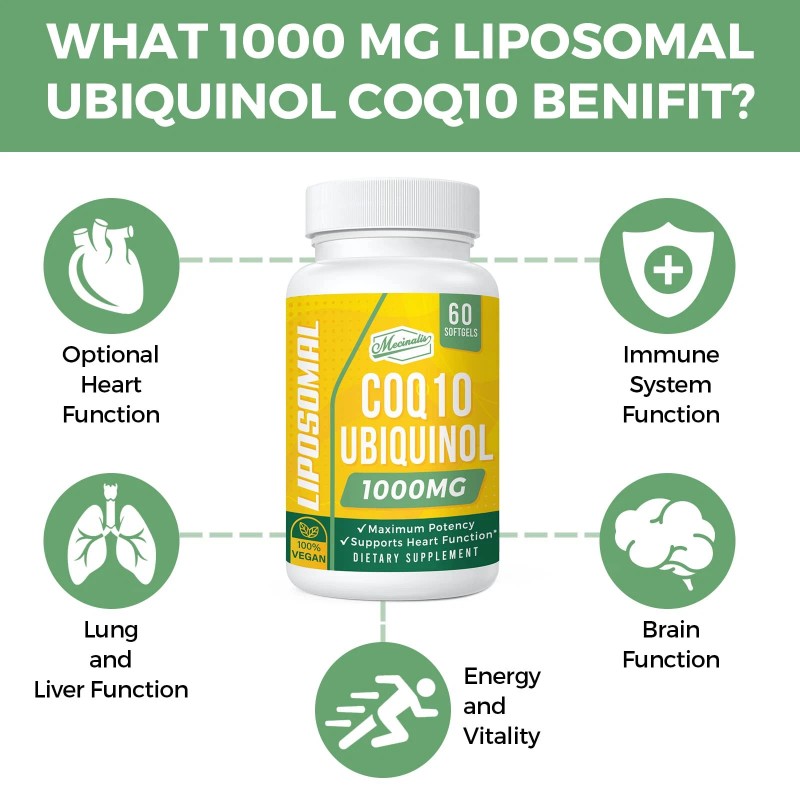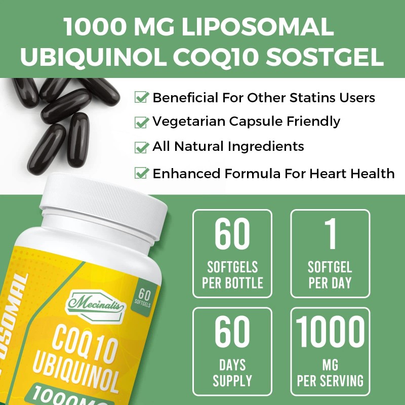 - MAXIMUM STRENGTH UBIQUINOL CoQ10 1000MG – CoQ10 levels in the heart and body may begin to naturally decline after age 40, while statin drugs may deplete the body’s CoQ10 levels. Mecinalis CoQ10 Ubiquinol supplement features double potency co q10. Liposomal CoQ10 1000mg supplement provides 1000mg per soft gel for a 60-day supply, beneficial to get your natural CoQ10 levels.