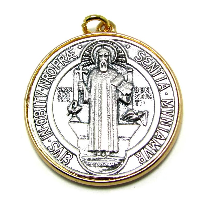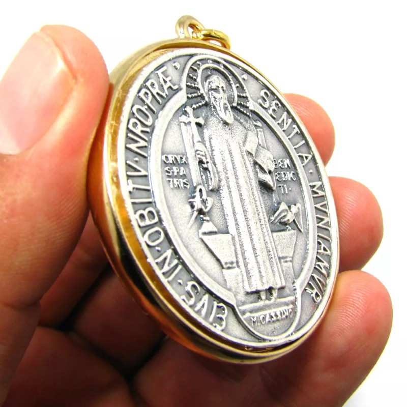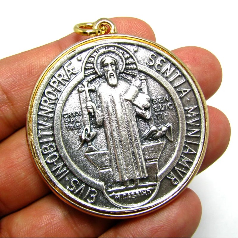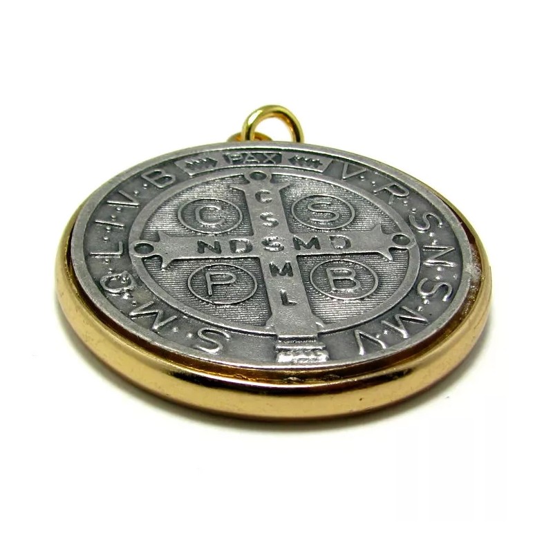 Medalla De San Benito St Benedict Large 48MM Italy Two Tone Gold Plated Pendant