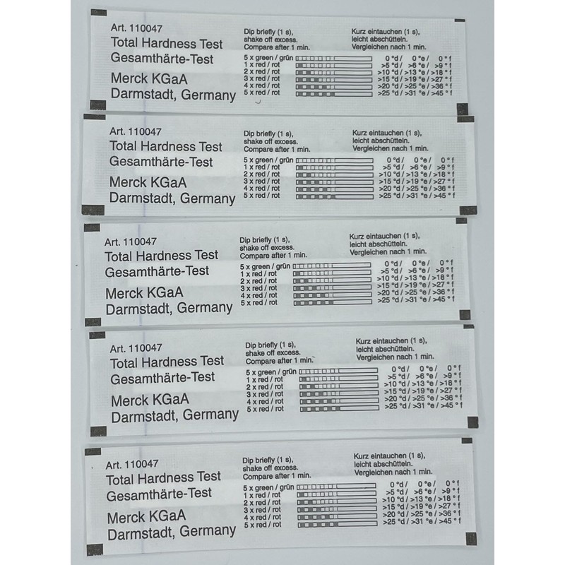 - ✔ [Result directly visible] 5 fields green = 0° dH, 1 field red = >5° dH, 2 fields red = >10° dH, 3 fields red = >15° dH, 4 fields red = >20° dH, 5 fields red = >25° dH