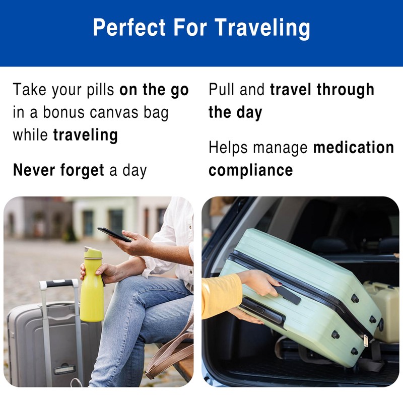 - 🚶 Travel Pouch & Tweezers for Easy On-the-Go Use Stay consistent with your medication even when traveling. The zippered travel pouch fits up to four daily pill boxes, while the included tweezers help pick up small pills with ease—perfect for those with limited dexterity or arthritis.
