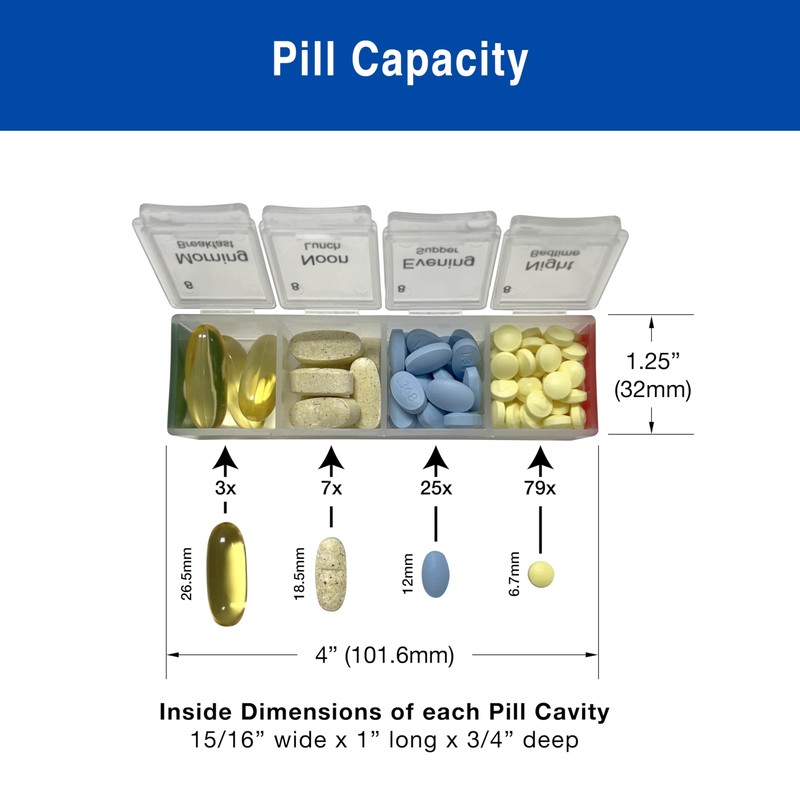 - 📅 Color-Coded Daily Pill Boxes with 4 Compartments Each portable pill box is labeled with the time of day (Morning, Noon, Evening, Night), making it easy to follow complex medication schedules. Great for caregivers, chronic condition management, and anyone on multiple prescriptions or supplements.