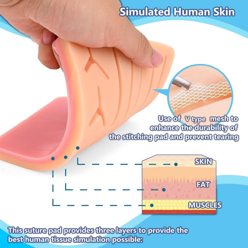 - ✔️ Our suture pads are made of high-quality food level silicone, no-smell, non-toxic, eco-friendly, true to life feeling, most important, it is durable for suture training. Our silicone pads each have 3 layers that replicate skin, fat, and muscle.Our standard suture pad has durable meshes under skin, 1 horizontal mesh between skin layer, moreover there are three "V" type vertical meshes which enhance the durability and not easy to rip when suturing.