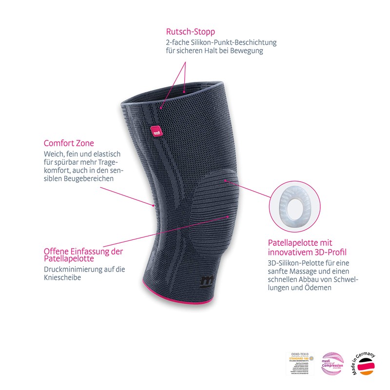 • Technology: the open edging of the patella pelotte minimises contact pressure on the kneecap when moving. The combination of circular knitting without seam and compressive knit effectively promotes pain relief in the knee.