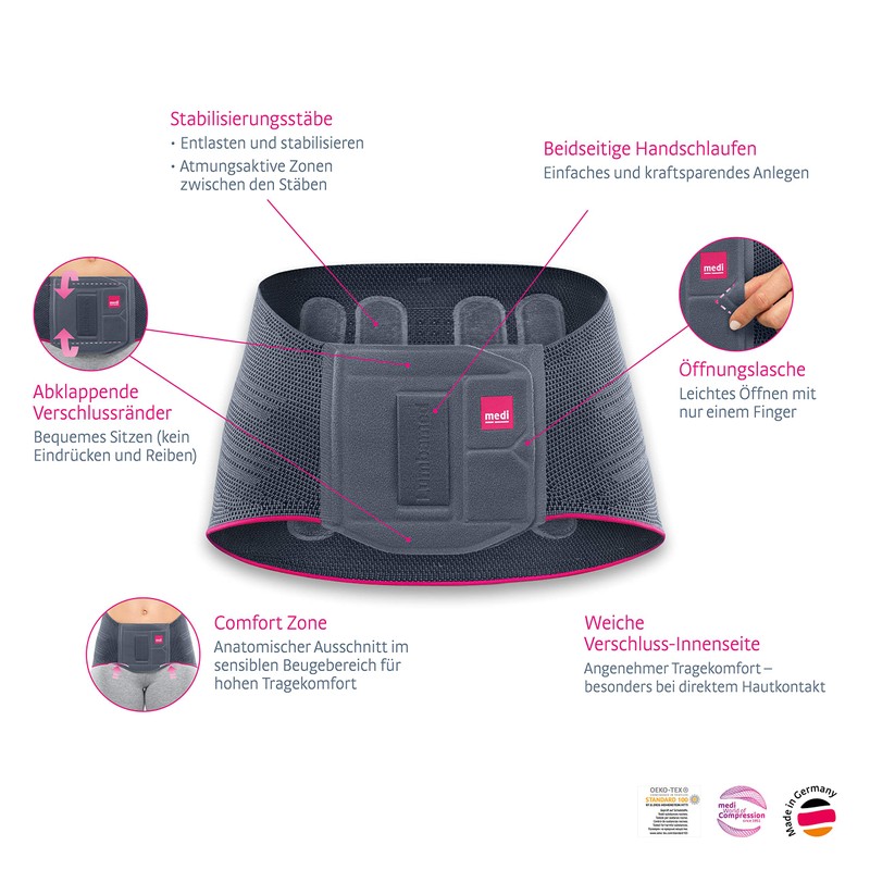 - Technology – The support elements integrated into the stabilising orthosis have a stabilising effect on the area of the lumbar spine