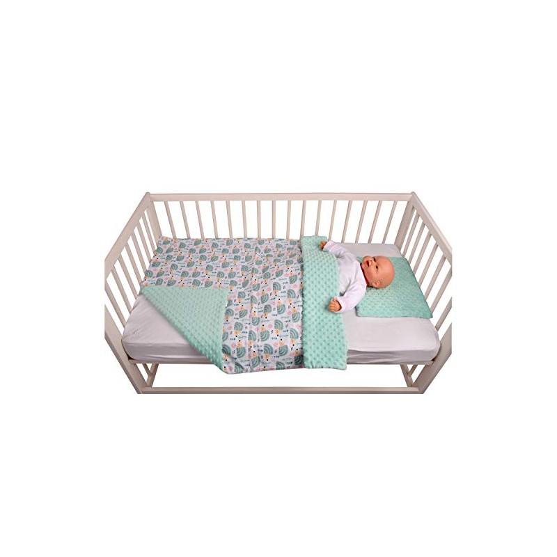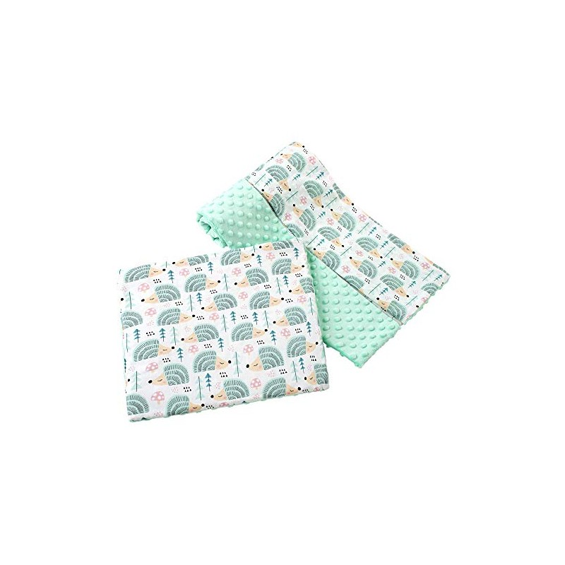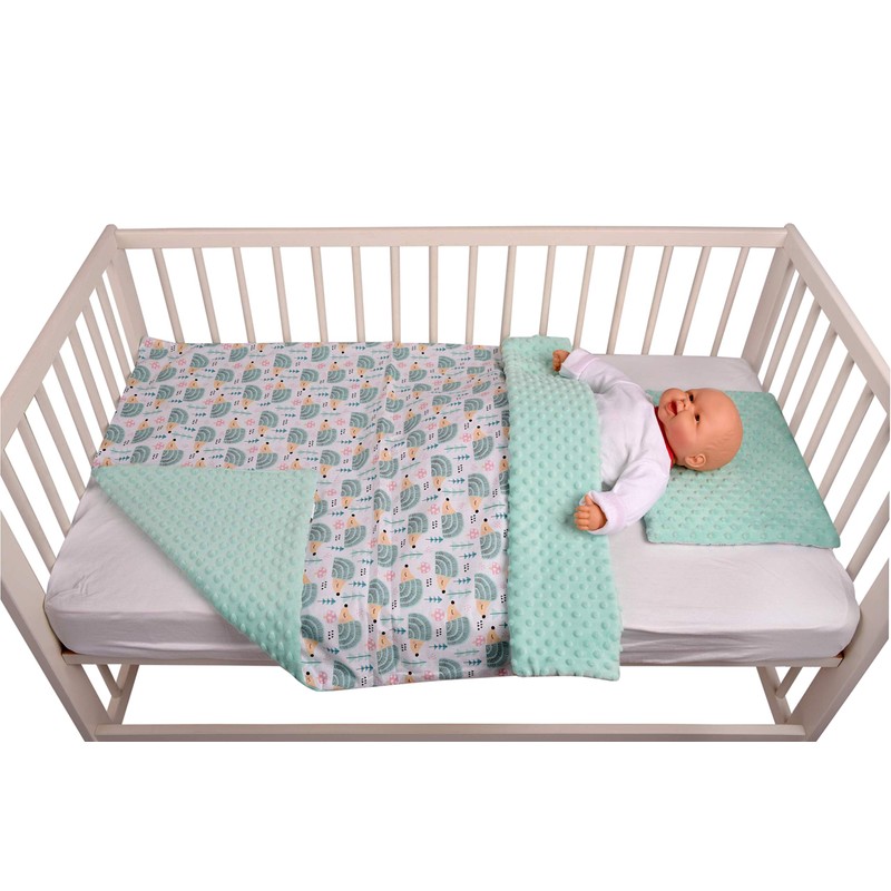 Medi Partners Baby Blanket Crawling Blanket with Pillow 100% Cotton Minky Children's Blanket Large Double-Sided 75 x 100 + 35 x 30 cm Multifunctional for Bed Pram (Mint Hedgehog with Mint Minky)