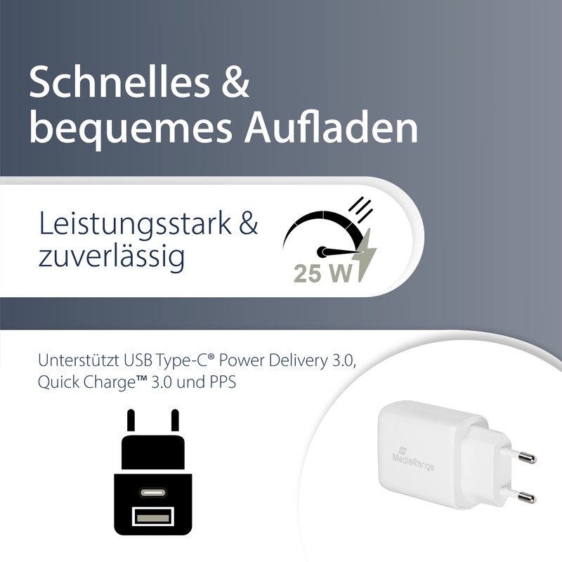 MediaRange 25 W Socket Charger with USB-A and USB-C Output, White