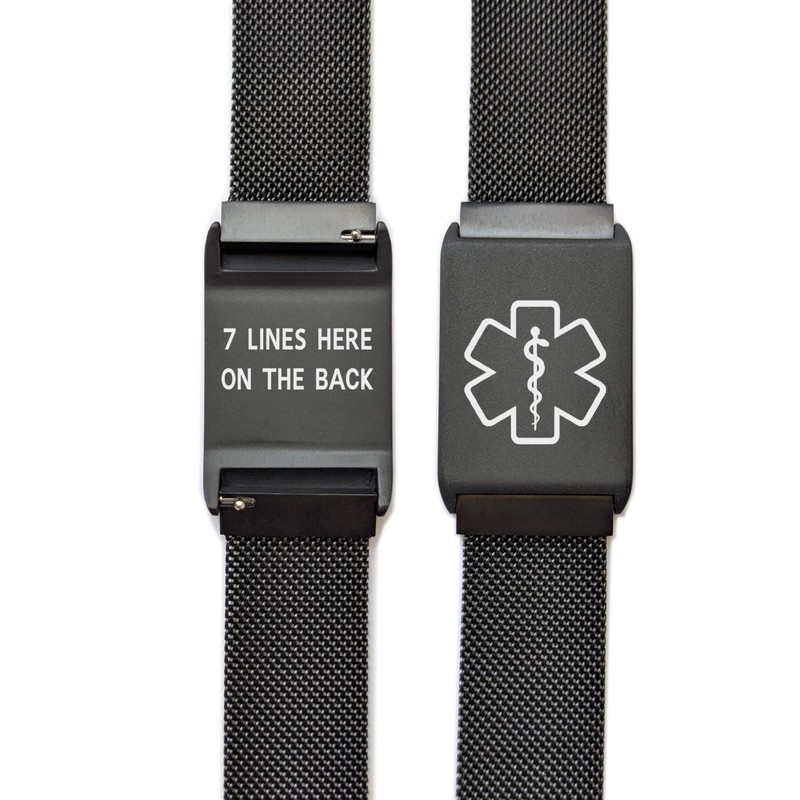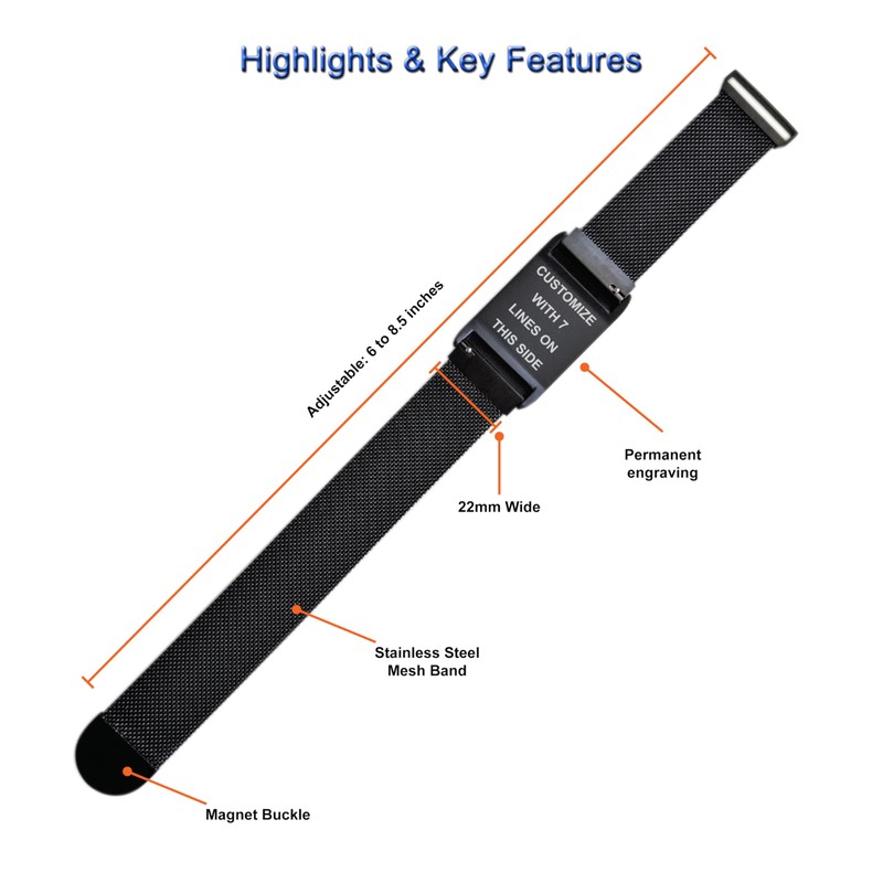Medical Alert ID Bracelet, Adjustable 6"- 8.5" Magnetic Mesh Band, Customize up to 7 Lines, Select a Color