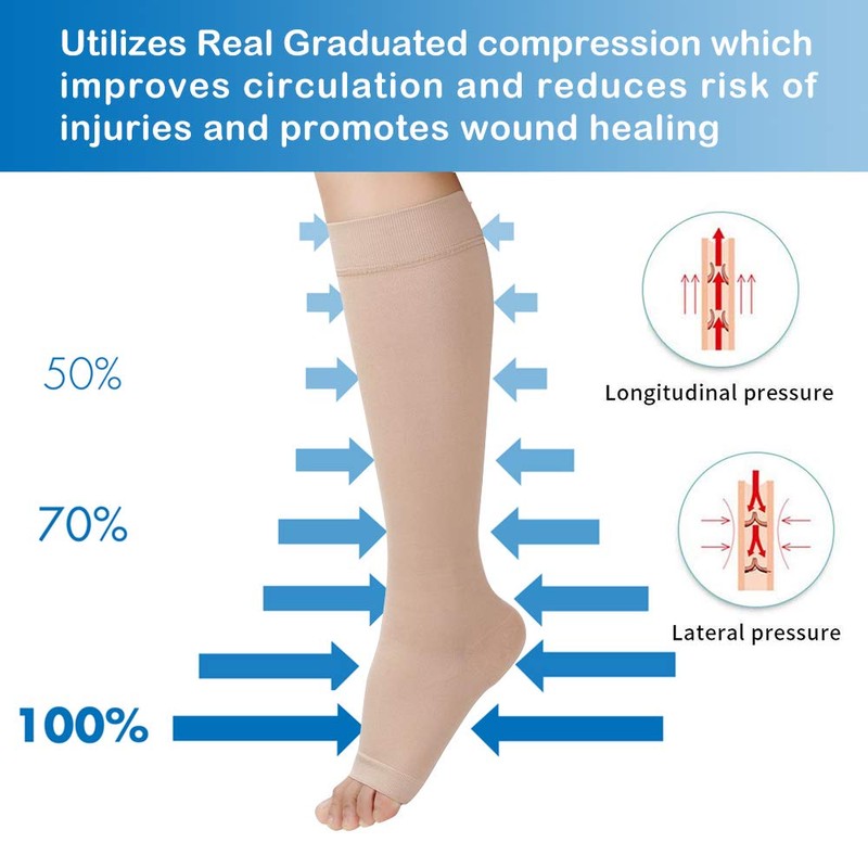 1. Professional care compression stockings with open toe with firm graduated compression of 20-30 mmHg.