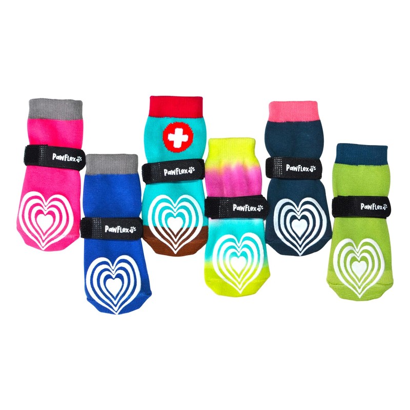 The special anti-slip heart design creates a specific functionality creating unlimited flexibility and grip without jeopardizing the full range of stretchability for maximum comfort. Our dog socks are made of the highest-grade cotton. They are super soft, stretchy, and breathable, providing the best and most secure fit for your dog’s paws. PawFlex Comfy Pawz Nonslip socks come 4 types; Full coverage long socks, low rise socks, long smooth waterproof rubber double dipped socks/booties, and low rise textured waterproof rubber double dipped socks.