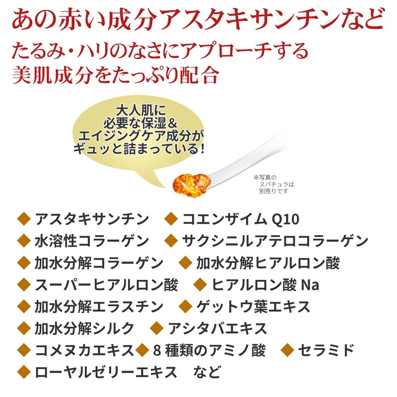 - (A generous amount of beauty ingredients such as Astaxanthine) In order to thoroughly approach adult skin concerns, it contains more than 16 types of moisturizing ingredients and aging care ingredients, including astaxanthin, coenzyme Q10, water-soluble collagen, succinyl terrocollagen, hydrolyzed collagen, hyalurone. Acid, super hyal Ronacid, sodium hyaluronic acid, hydrolyzed elastin, ghetto leaf extract, hydrolyzed silk, acita extract, commenuka extract, 8 types of amino acids, ceramide, royal jelly extract