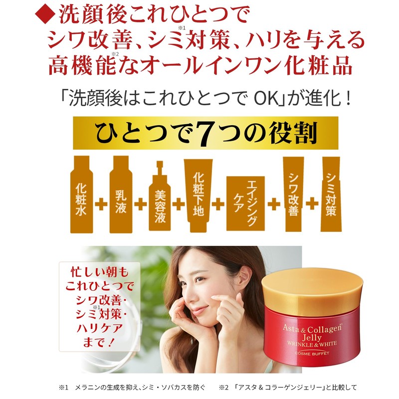 - (Medicated All-in-One Jerry for Wrinkles and Stain Resistant) Medicated Asta and Collagen Jelly is a special edition of the best-selling Asta & Collagen Jelly. The unique aging care and moisturizing properties of "Asta & Collagen Jelly", and the convenience of completing in one step after washing the face, we have created a highly functional all-in-one gel with an active ingredient Niacinamide to improve wrinkles, prevent stains, and provide a sense of moisture and firmness