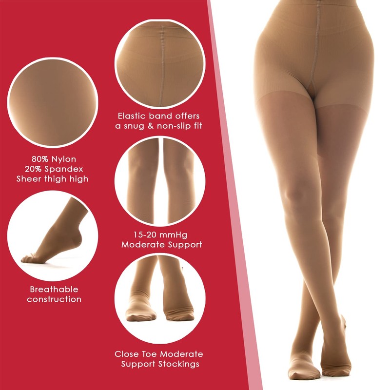 - Medias de apoyo moderado con puntera cerrada: ligeras, transpirables y duraderas, diseño de punta cerrada perfecto para aquellos que requieren un apoyo moderado. Con una compresión de 15 a 20 mmHg, nuestras medias de compresión de cintura son ideales para personas que tienen una hinchazón menor en sus piernas o aquellos que trabajan mucho en sus pies y pasajeros frecuentes de aerolíneas.