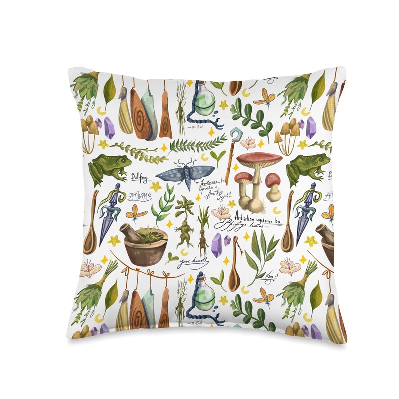 Medicinal Herbs Botanical Amanita Mushrooms Plants Pattern Throw Pillow