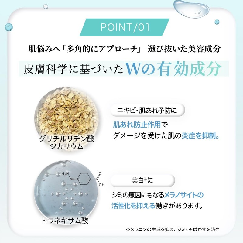 Tranexamic Acid*, Dipotassium Glycyrrhizinate *, 1,3-butyl glycol, concentrated glycerin, 1,2-Pentandiol, diglycerin, maltitol, trimethylglysine, xanthanum gum, diethylenethylamine pentoacetate liquid, phenoxyethanol, sodium pilocyethanol, sodium citrate, citrate. citric acid Honeysuckle extract, cavoca extract, gouron extract, aloe extract (2) *Active ingredients; Non-indicated "Other ingredients"