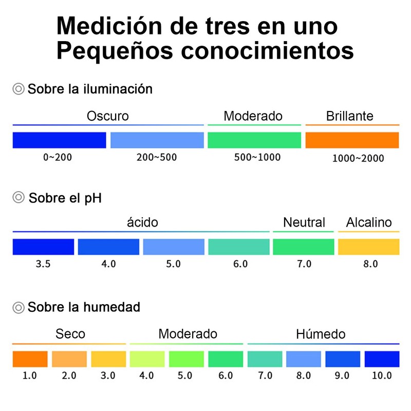 Rango de medición: grado de luz, valor de humedad, valor de PH