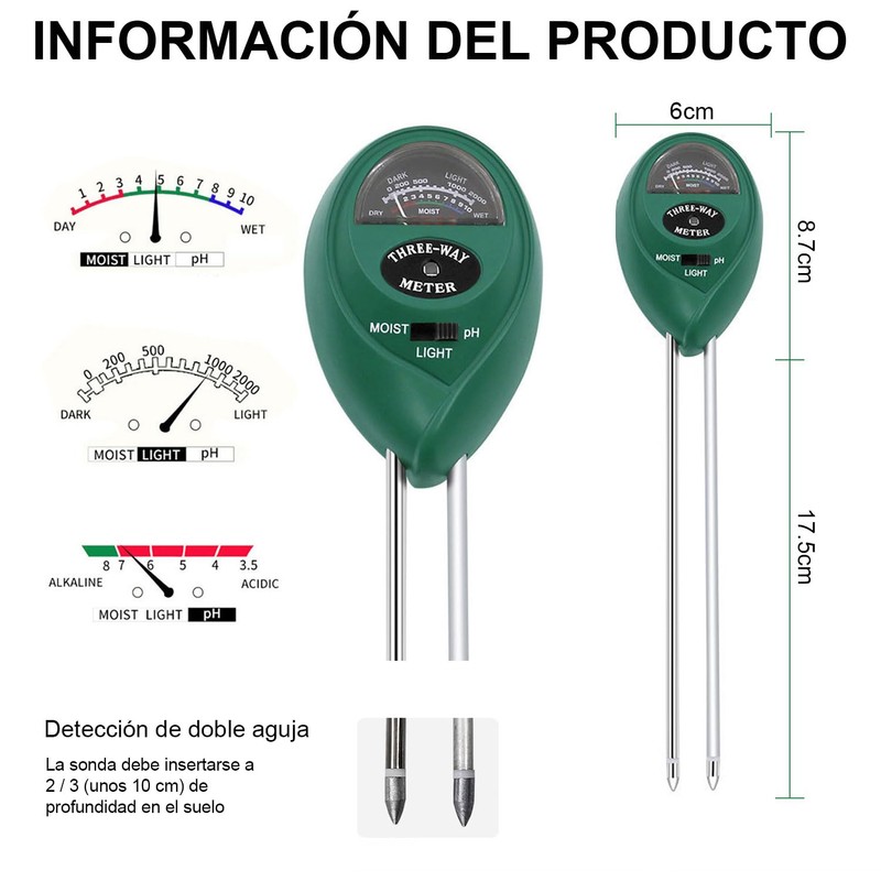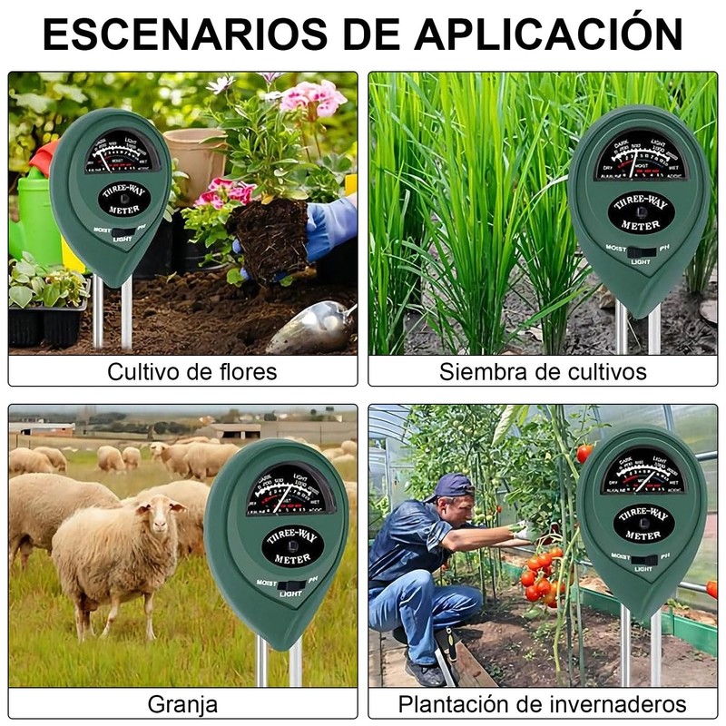 - Medidor de humedad, la herramienta perfecta para comprobar las condiciones del suelo (humedad/luz/pH) de frutas, flores, verduras, arbustos, etc., con gran precisión y fácil manejo, podrá cuidar bien de sus plantas.