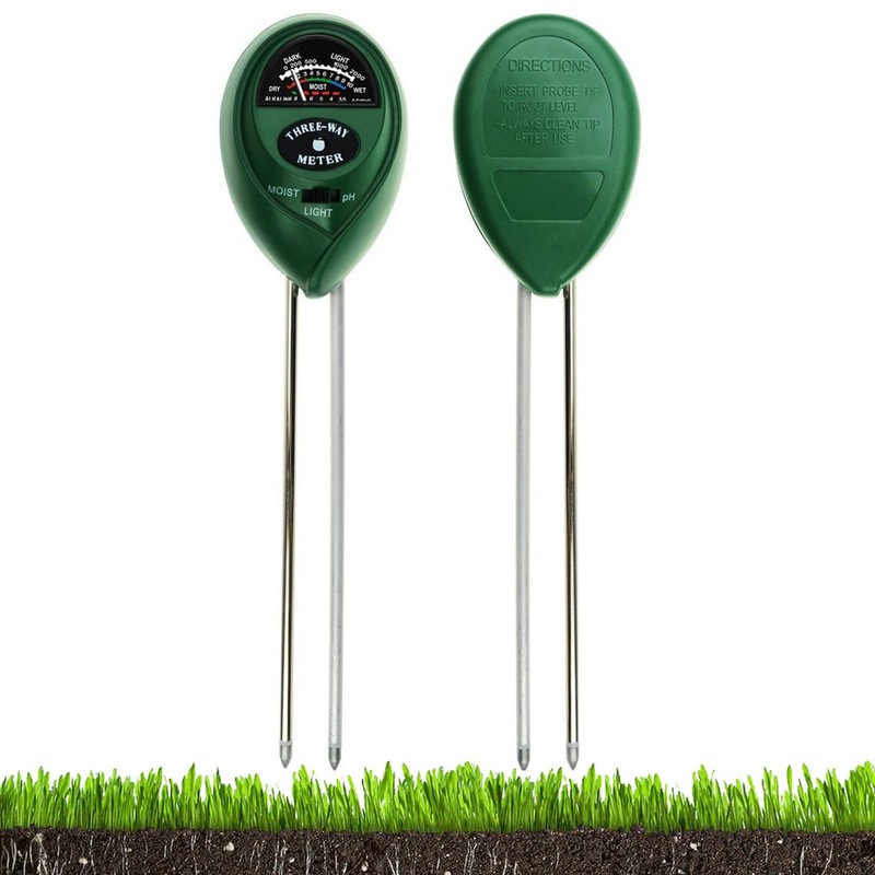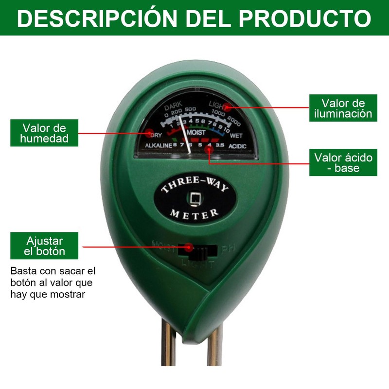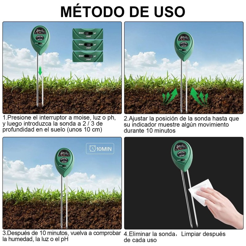 - Medidor de humedad para plantas, puede medir la humedad del suelo, el PH y la intensidad de la luz solar. Te ayuda rápidamente a saber siempre cuándo necesitas regar tus plantas, comprobar el PH del suelo y ver si están recibiendo suficiente luz solar.