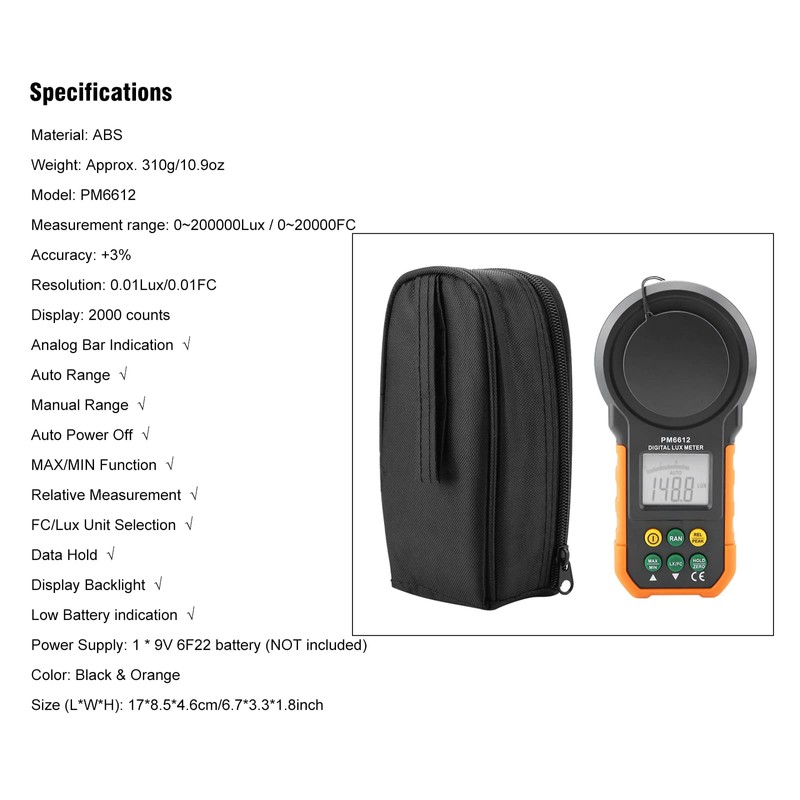 - ☛ Obtendrá: 1 * Tacómetro digital PM6612 / PM6612L, 1 * Bolsa negra (Herramienta de prueba de luz profesional de alta precisión); Material: ABS; Modelo: PM6612, PM6612L (Opcional).