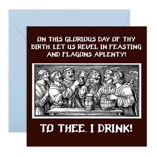 - BIRTHDAY CARD - Celebrate in true medieval style with this humorous birthday card! Featuring a vintage illustration of merry revelers and an old-world toast, it’s the perfect card for history buffs, beer lovers, and fans of medieval banter. Blank inside for your own personal message.