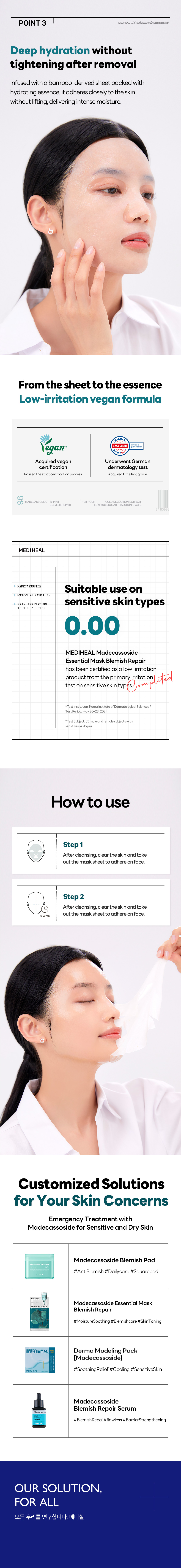 Resolves and soothes repeated skin scars on weakened skin. The 98% pure madecassoside improves skin scars and barrier. Provides soothing of red skin, reduces skin temperature, improves melanin area, skin tone, skin moisture content, moisture barrier, and skin texture. The bamboo-based sheet containing a high content of moisturizing essence is comfortably applied on uneven skin. Acquired vegan certification and completed German dermatology test. Certified as low irritating product in the primary irritation test on sensitive skin types. Recommended for those who experience repeated pigmentation, uneven skin troubles, want easy care of skin soothing and skin barrier, want to have smooth and moisturizing skin without any stickiness, and want to use a comfortable product by using low irritating vegan mask.